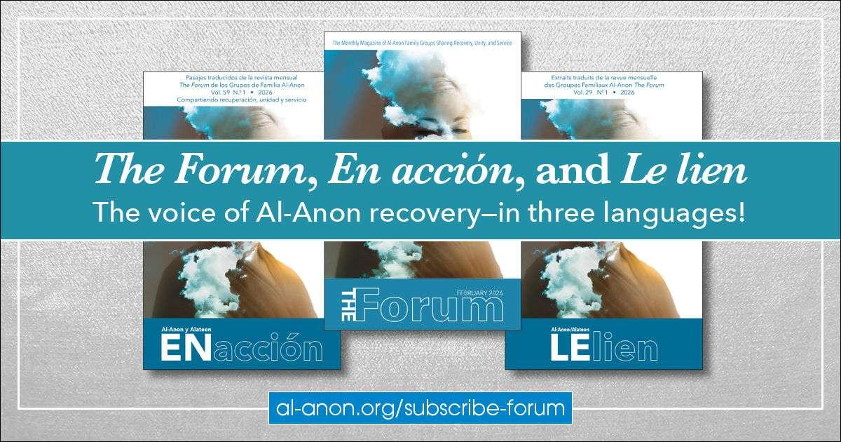 Did you know that The Forum is just one of three print-subscription magazines published by Al‑Anon’s World Service Office (WSO)? For our Spanish- and French-speaking members, we publish the bimonthly magazines Al‑Anon y Alateen en acción and Le lien respectively. All our magazines feature articles by members sharing their experiences finding hope and help in Al‑Anon, along with news from the WSO.