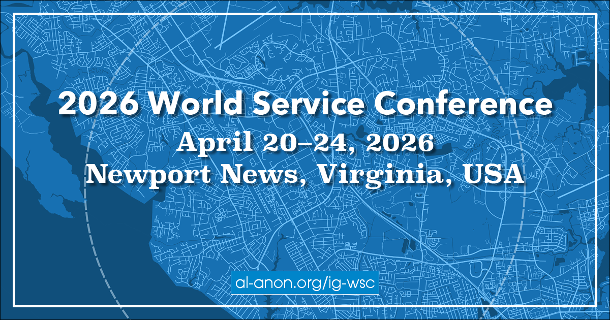 The 66th World Service Conference (WSC) will take place April 20–24, 2026 in Newport News, Virginia, USA. The WSC is “Al‑Anon’s annual business meeting, which is attended by all Delegates from the World Service Conference Structure, representatives from other countries, members of the Board of Trustees and Executive Committee, voting members of the World Service Office (WSO) administrative Staff, and other WSO personnel. The Conference provides guidance to the WSO on service matters that are brought to its attention” (“World Service Handbook” section of the Al‑Anon/Alateen Service Manual [P-24/27], page 141).